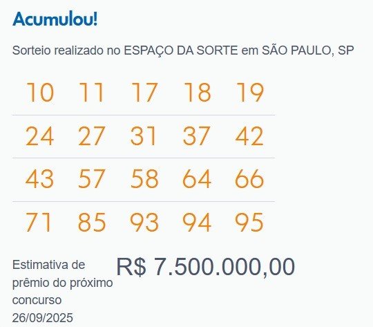 Segundo a Caixa, o prêmio principal acumulou R$ 7,5 milhões, e o próximo sorteio deve ocorrer na sexta-feira (26).