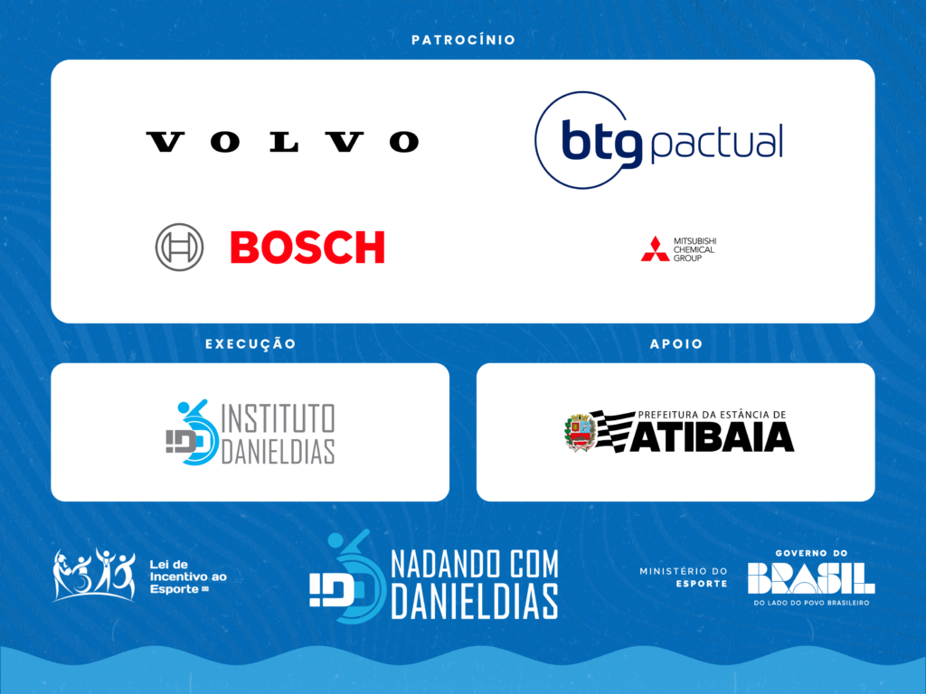 O projeto Nadando com Daniel Dias em Atibaia tem execução do Instituto Daniel Dias, com apoio da Prefeitura da Estância de Atibaia, e é viabilizado pela Lei de Incentivo ao Esporte, programa do Ministério do Esporte e Governo Federal. As duas sedes da cidade contam com o patrocínio da Volvo, BTG Pactual, Bosch e Mitsubishi Chemical Group.